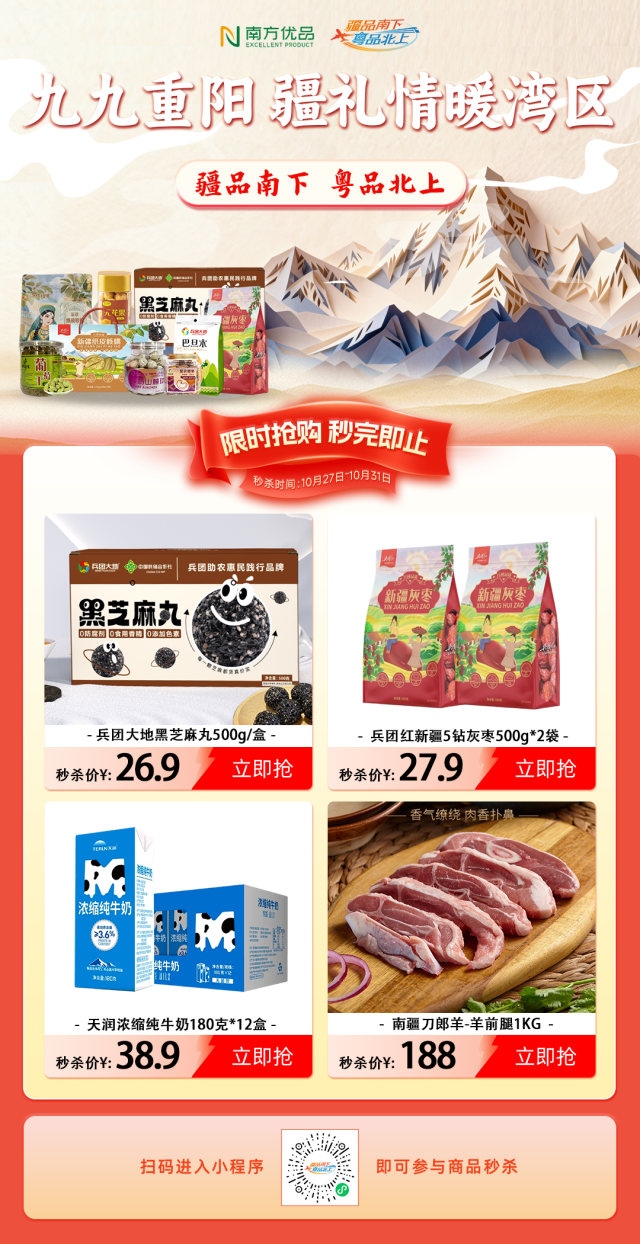 金秋送爽,疆品节主丹桂飘香,南下暖心又是粤品一年重阳至。“疆品南下 粤品北上”线上主平台特别策划“重阳暖心季”主题周活动于10月27日至30日上线,北上以第三师图木舒克市的重阳质朴风物为媒,以电商平台为桥,题周连疆粤之情。启幕