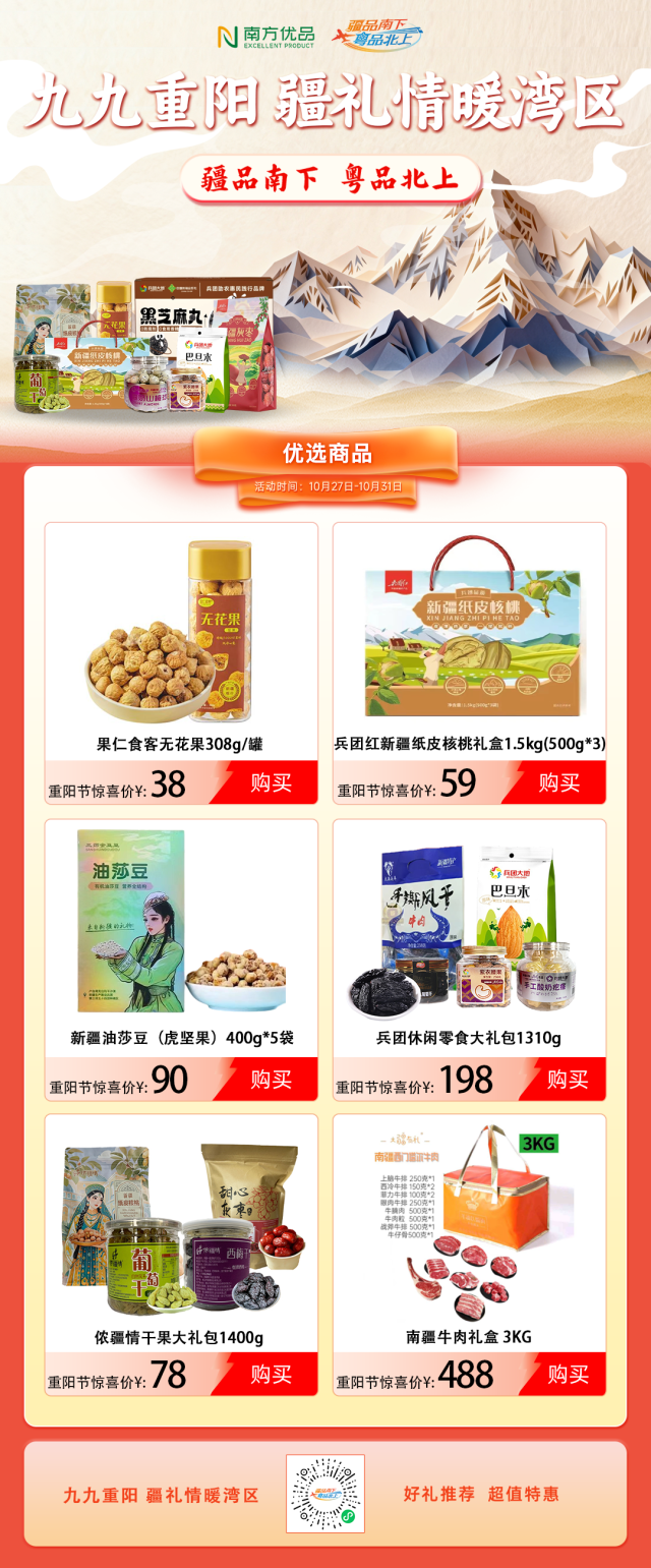本次重阳节主题周活动,正是“疆品南下”合作成果的一次集中展示。依托南方报业传媒集团的强大公信力与全媒体传播矩阵,不仅为消费者严选品质好物,更通过媒体资源广泛传播,讲述粤疆协作的动人故事,不断为两地产业协作、为图木舒克市的特色产业发展注入了强劲的“湾区动力”。